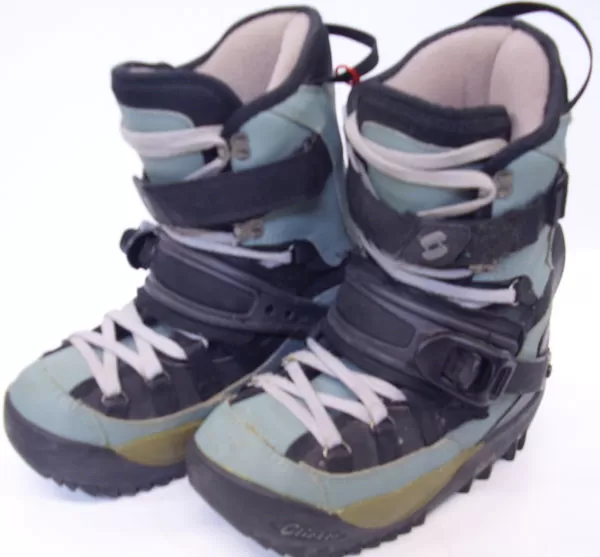 Comes with an ankle ratchet strap for superior heel hold and velcro power strap for upper ankle support. There is no removeable liner in this boot. Adjustable hinge on the highback allows for lateral flex and side to side movement (so they don’t feel like casts on your feet.) There is also a quick release, forward lean adjuster for on-the-fly forward lean adjustment. Back is made of a reinforced hard plastic to maintain stiffness and support in the boot when riding. Although these boots are used, they still have lots of life left in them.